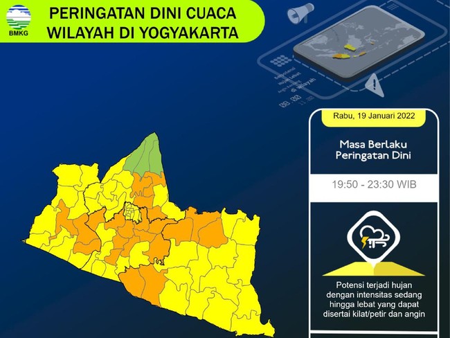"Update peringatan dini cuaca wilayah DI Yogyakarta pukul 19.35 WIB masih berpotensi terjadi hujan dengan intensitas sedang hingga lebat yang dapat disertai kilat/petir dan angin kencang pada pukul 19.50 WIB," tulis Prakirawan BMKG Yogyakarta dalam keterangannya, Rabu (19/1/2022).