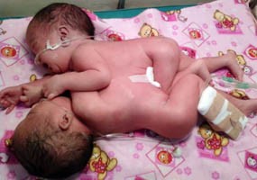 Bayi kembar siam tersebut lahir melalui operasi caesar pada Senin (8/3/2010) kemarin pada pukul 15.35 WIB. Tim dokter memutuskan melakukan operasi setelah kelahirannya dianggap prematur dan sang ibu mengalami pecah ketuban lebih awal.