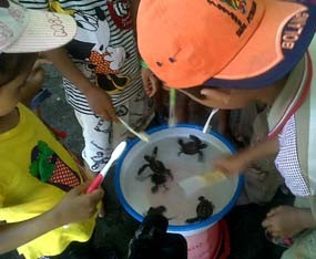 Para siswa diajak berkeliling dari satu kolam ke kolam lainnya. Kolam atau aquarium itu tempat pembesaran tukik (anak penyu). Dengan dipandu Wiyanto Hadi Tanajo, ketua yayasan, para siswa dikenalkan bagaimana merawat tukik yang benar hingga siap dilepasliarkan ke laut lepas.