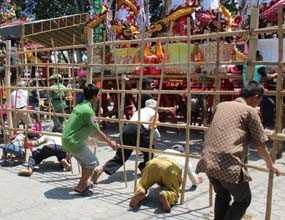 Para jemaat ini melakukan ritual dengan membakar dupa sambil berdoa kepada para leluhur sambil memutar sebanyak 3 kali. Usai ibadah warga Tri Dharma ini saling berebut gunungan sesaji berbaur dengan warga sekitar yang sejak pagi telah menunggu di luar tempat ibadah.