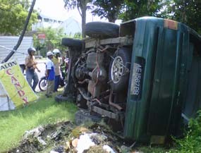 "Alhamdulillah saya selamat mas, hanya lecet pada tangan. Tadi perjalanan dari Magetan menuju Kota Madiun, namun saat menyetir mengantuk sekali. Tiba-tiba menabrak dan terbalik, ini salah saya," tutur Sudarno kepada detiksurabaya.com, Rabu (6/2/2013).