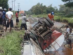 "Sebagian isi muatannya tadi sudah disedot. Saya tidak menguasai kemudi setelah ban kanan terperosok lubang proyek tangkis. Truk langsung miring dan kemudian terguling masuk ke sungai. Untung air sungai sedang kering, jadi saya bisa langsung keluar," tukas Eko di lokasi kejadian.