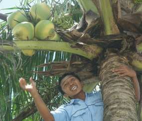 Sepintas, batang kelapa setinggi 4 meter itu memang tak ada bedanya dengan tanaman kelapa lain yang tumbuh berjajar di sekitarnya. Namun jika dicermati, warna buahnya tampak lebih mencolok. Semua butiran buah, baik yang berukuran kecil maupun yang sudah tua bermotif loreng.