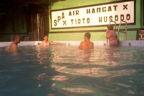 "Urat-urat yang kaku terasa lemas. Tapi syaratnya jangan langsung nyebur, harus pelan-pelan," kata Sukinah, seorang ibu asal Pacitan sambil merendam separuh kaki ke kolam.