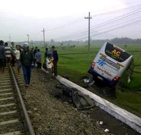Sebelumnya, Senin (21/4/2013) malam bus Sugeng Rahayu ditabrak KA Matarmaja di perlintasan kereta Kecamatan Bagor Kabupaten Nganjuk. Meski sempat terseret sejauh 100 meter dan masuk sawah, tak ada korban pada kecelakaan ini.