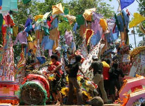 Usai melakukan sembahyang dan pemukulan bedug yang dilakukan sesepuh klenteng, ratusan warga sekitar berbaur dengan warga Konghucu berebut berkah dan menyerbu gunungan.