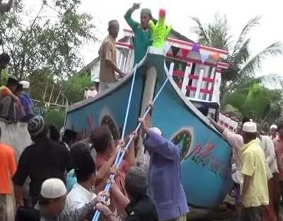 Ratusan warga sekitar dikerahkan untuk menarik perahu dari atas bukit untuk diturunkan ke laut. Rencananya perahu ini akan dibawa ke Pantai Salopeng sekitar 20 KM dari rumah sang kiai di Desa Tenunan Kecamatan Manding Sumenep.