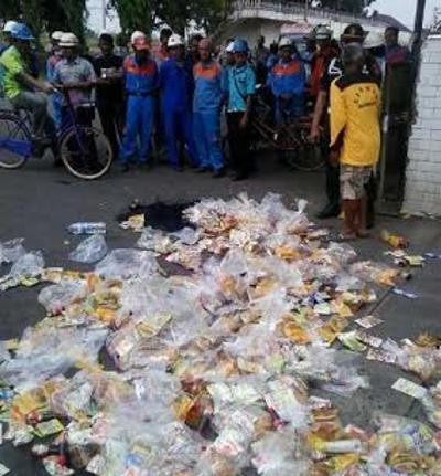 Perwakilan warga yang kesal, mengembalikan parcel dengan cara dibuang di halaman kantor PT Ajinomoto. Akibatnya, parcel-parcel itupun berserakan seperti sampah.