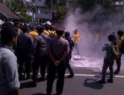 Puluhan petugas memutuskan membubarkan paksa aksi mahasiswa ini. Korps bersergam cokelat menembakkan gas air mata ke arah mahasiswa. Tak hanya itu, petugas menyerbu mahasiswa menggunakan tongkat rotan.