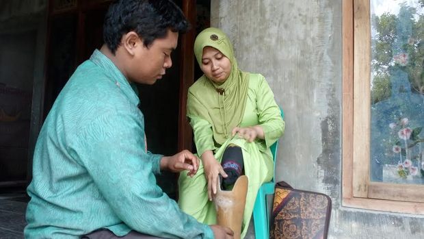 Miftahul Khoir memasang kaki palsu dibantu suaminya |