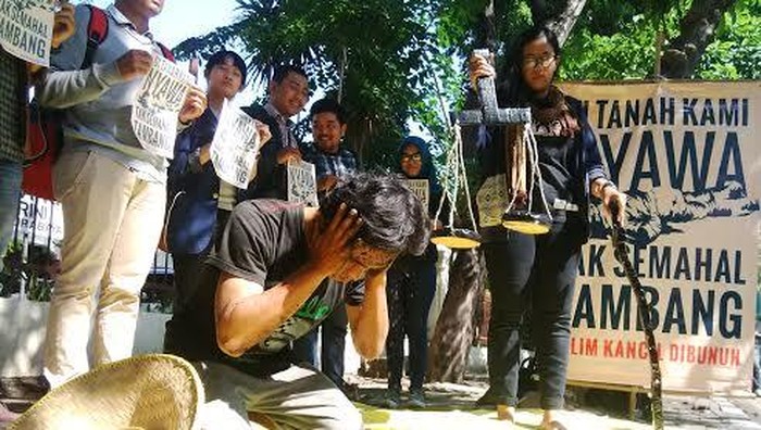 Aksi damai dilakukan para aktivis dengan berdiri berbaris sambil memegang poster bertuliskan 'Di tanah kami nyawa tak semahal tambang, Salim Kancil dibunuh'. Dua poster dalam ukuran lebih besar terpancang di ujung bariaan.