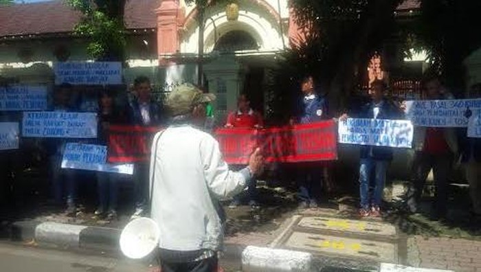 "Tambang pasir besi di Lumajang menjadi ajang kerakusan pejabat. Bahkan nyawa tiada harganya lagi. Buktinya penganiayaan terhadap Tosan dan pembantaian kepada Salim Kancil," teriak korlap aksi, Yanto Ireng, dalam orasinya di depan Pengadilan Negeri (PN) Surabaya, Kamis (25/2/2016).