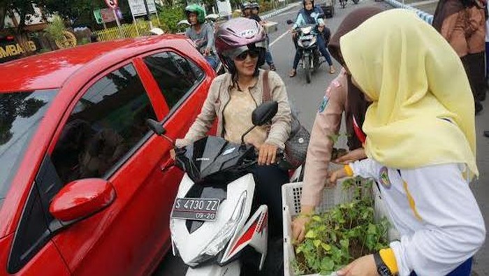 Meski dilakukan di jalan raya, kegiatan bagi bibit cabe dan pupuk kompos gratis ini disambut baik para pengguna jalan. Tak sedikit dari mereka yang meminta lebih dari satu bibit cabai. (fat/fat)