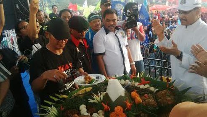 Masih di atas panggung, Gus Ipul kemudian mengajak pewakilan buruh untuk ikut bersama memotong tumpeng yang telah disiapkan. Dengan iringan lagu Jamrud berjudul Selamat Ulang Tahun, tumpeng itu pun dipotong dan diserahkan perwakilan buruh ke Gus Ipul.