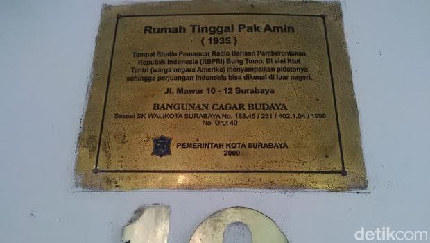 Prasasti berlempeng emas yang tertempel di tembok rumah radio Bung Tomo (Foto: Imam Wahyudiyanta) |