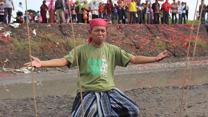 Salah satu warga melakukan aksi treatikal di kolam lumpur atau pon lumpur dan membacakan teks Pancasila sertapuisi berjudul 'Manusia Lumpur'.