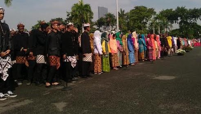 Menariknya, peserta upacara dari mulai dari lurah hingga jajaran kepala dinas ini menggunakan pakaian khas ala Cak dan Ning Suroboyo-an. Tak terkecuali Risma yang memakai kebaya putih dibalut kerudung putih dengan bawahan merah muda.