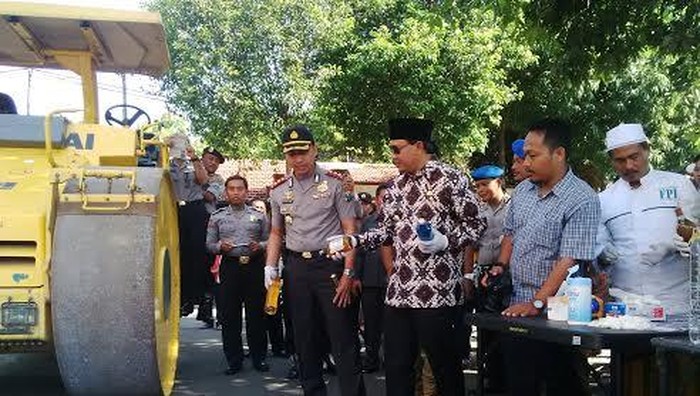 Setelah memberi sambutan, Gus Irsyad langsung mengajak AKBP Aldian naik ke tendem roller. Setelah memberi aba-aba, alat berat tersebut dijalankan dan melindas ribuan botol miras.