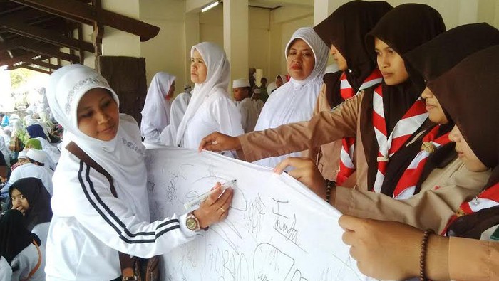 Santri dan santriwati mulai memenuhi ampiteater Taman Candra Wilwatikta, Sabtu (19/11/2016). Begitu para santri berkumpul, kemudian dilaksanakan apel akbar. Apel juga dihadiri Wakil Gubernur Jawa Timur Saifullah Yusufn atau Gus Ipul, Bupati Pasuruan Irsyad Yusuf dan para ulama.