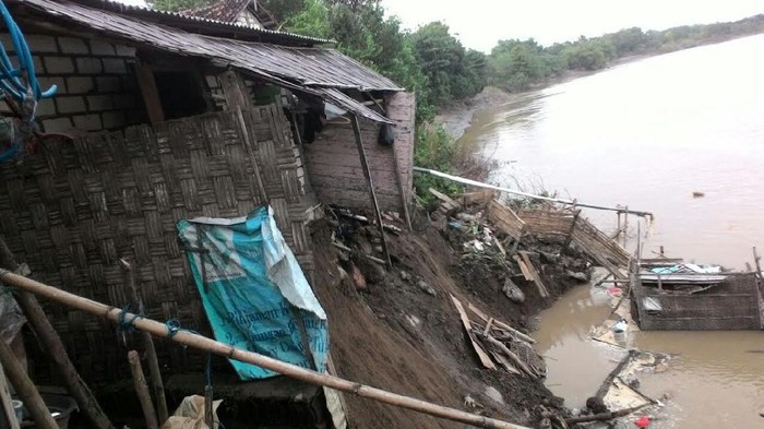 Kepala desa Laren Wiwit Rudianto menyatakan kerusakan terjadi di bagian belakang ke lima rumah semi permanen yang berdiri di bibir sungai.