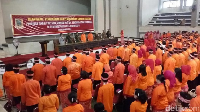 Pelantikan, pengukuhan, dan pengambilan sumpah jabatan pimpinan tinggi pratama, administrator, pengawas dan pelaksana di Pemkot Mojokerto digelar di GOR Seni Majapahit usai salat Jumat, (30/12/2016).