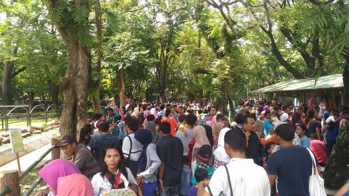 Dari pantauan detikcom, Minggu (1/1/2017), suasana di KBS benar-benar padat. Pengunjung di dalam taman satwa ini berjubel memenuhi setiap