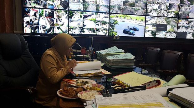 Bagi Wali Kota Risma makan di meja kerja sudah menjadi kebiasaan dirinya selama ini. "Piye maneh, kerjaan banyak ya sambil ta makan," katanya.