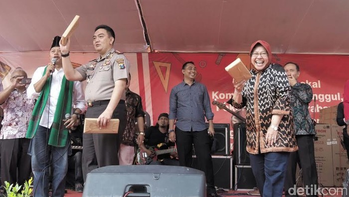 Bersama Kapolrestabes Kombes Pol M Iqbal, Risma terlihat membagi bagikan bingkisan kepada para peserta apel. Selain bingkisan, berbagai hadiah juga sudah disiapkan mulai dari sepeda angin, magicom hingga televisi LCD.