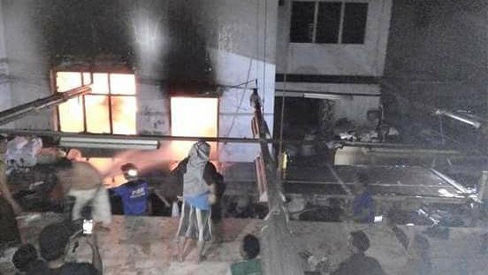 Kebakaran di lingkungan padat ini menyebabkan karyawan yang tengah bekerja panik. Mereka berusaha memadamkan api dengan peralatan seadanya.