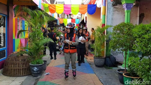 Dengan menggunakan roller blade atau sepatu roda, Satpoltik dan Srikandi menyusuri perkampungan padat penduduk sambil menempelkan stiker dan memberikan sosialisasi pada warga.
