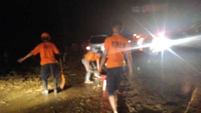 Upaya penanganan yang dilakukan yakni melakukan pembersihan tanah dan kayu yang terbawa longsor agar arus lalu lintas kembali lancar.