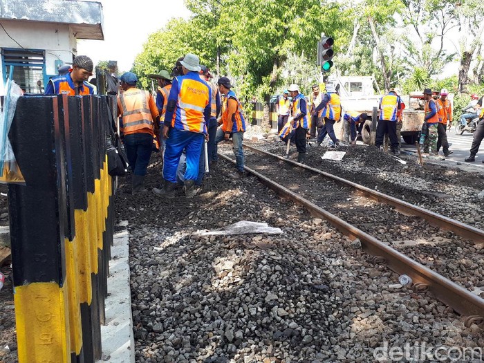 Dari pantauan detikcom, puluhan pekerja terlihat bahu membahu menutup lintasan dengan kerikil dan pasir. Mereka bergantian menuju empat titik lintasan yang ditutup. (ze/fat)