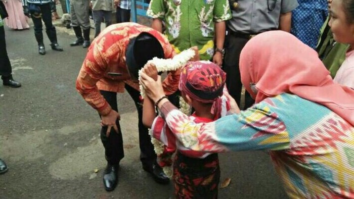 Orang nomor satu di Kabupaten Pasuruan mendapat kalungan bunga dari seorang warok cilik. Dan sebagai wujud apresiasi, sang warok lantas dinaikkan ke atas gemblak.