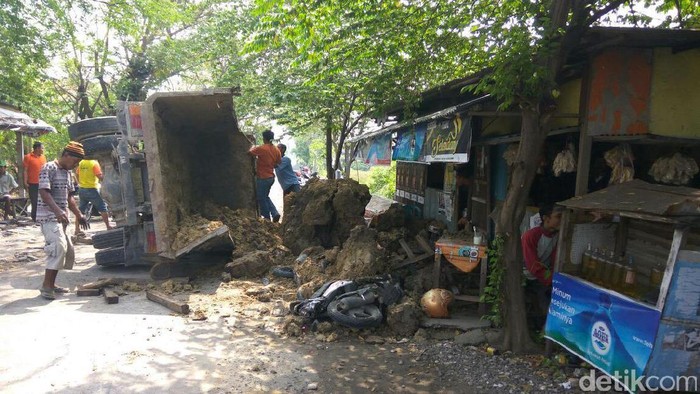 Tak kuasa mengendalikan laju kendaraan, dump truk yang dikemudiakan Sumaryono, warga Desa Tegalrejo, Kecamatan Merakurak, Tuban tersebut kemudian terguling.