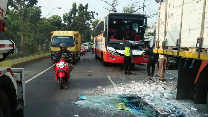 Akibat tabrakan itu, kaca depan bus Harapan Jaya hancur. Bodi depan sisi kiri bus juga ringsek. Sementara sebagian muatan bata putih truk tronton Hino nopol N 9861 US berserakan di jalan akibat ditabrak bus dari belakang.