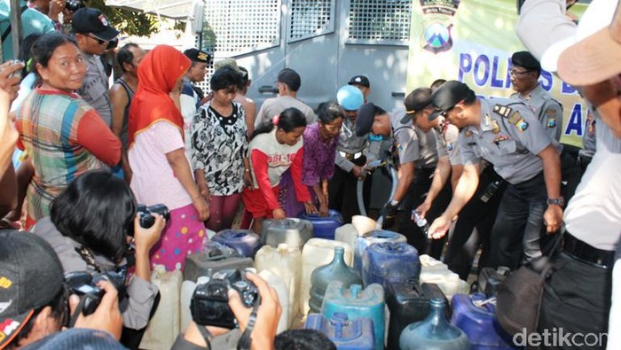 Dengan tertib ratusan warga mengantre dengan menggunakan alat penampung air seperti jeriken, timba (ember), tong plastik, dan alat penampungan air seadanya.