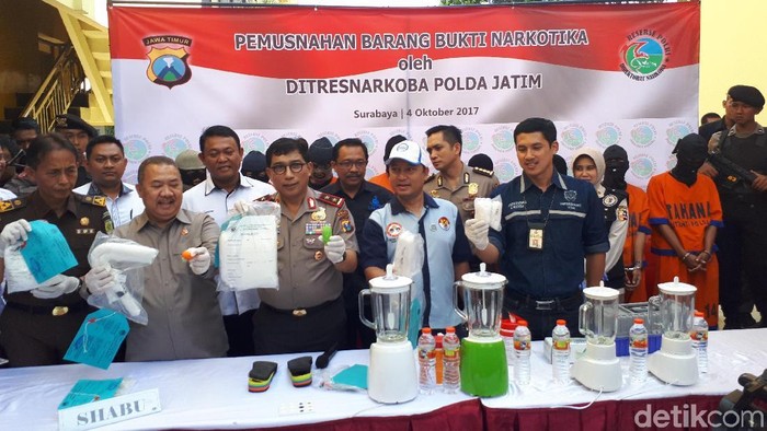 "Yang agak aneh barang ini (bungkusan sabu), dimasukkan ke kelamin wanita. Ini seroang perempuan yang berangkat dari Malaysia dan memasukan barang (narkoba) ke kemaluannya sejak perjalanan dari Malaysia. Ini cukup memprihatinkan," ujar Kapolda Jatim di sela pemusnahan barang bukti di Mapolda Jatim, Jalan A Yani, Surabaya, Rabu (4/10/2017).