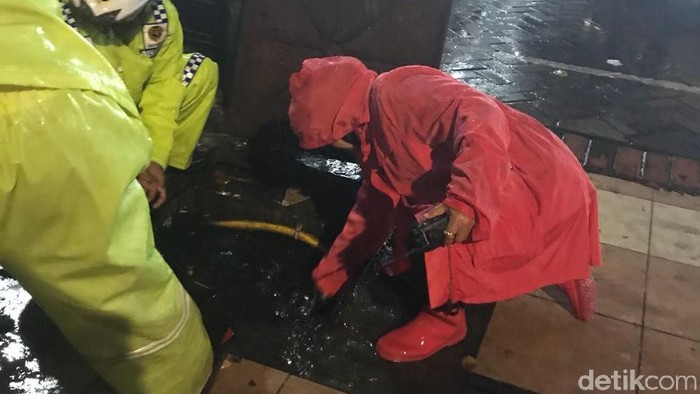 Nampaknya Risma yang mengenakan jas hujan dan sepatu boots warna pink mencurigai ada saluran air sekitar tersebut yang tersumbat sehingga memicu terjadinya genangan di jalan raya.