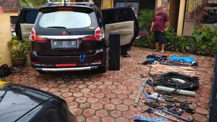 Diantaranya, tiga gulung kabel listrik, 34 potong kabel tembaga satu meteran, dua gunting potong, dua gergaji besi, tiga lampu senter, sebuah parang, tiga tang, dan satu besi pengait, serta alat isap sabu.