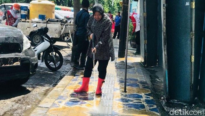 Selain bersih-bersih menggunakan sapu lidi yang diambil dari dalam mobil dinasnya, Risma juga ikut menyemprot lantai keramik pedestrian di kawasan tersebut.