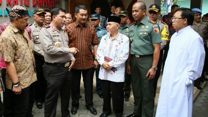 Kapolda Jatim dan Pangdam V/Brawijaya bersama tokoh lintas agama di Gereja Maria Ratu Damai, Banyuwangi (Foto: Ardian Fanani)