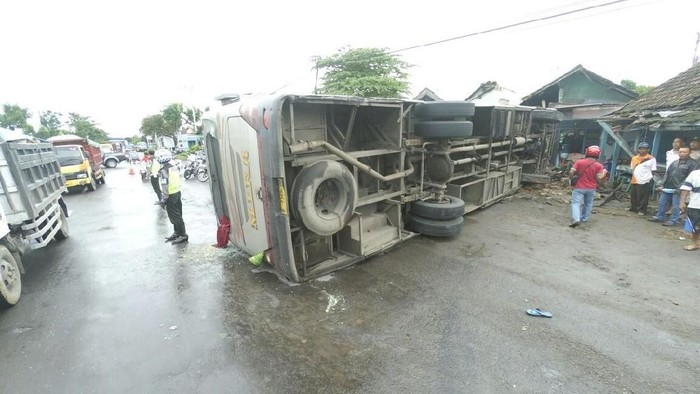"Sopir bus berusaha menghindari sepeda motor dengan banting stir ke kiri sehingga terguling, juga mengenai rumah warga," ujarnya.