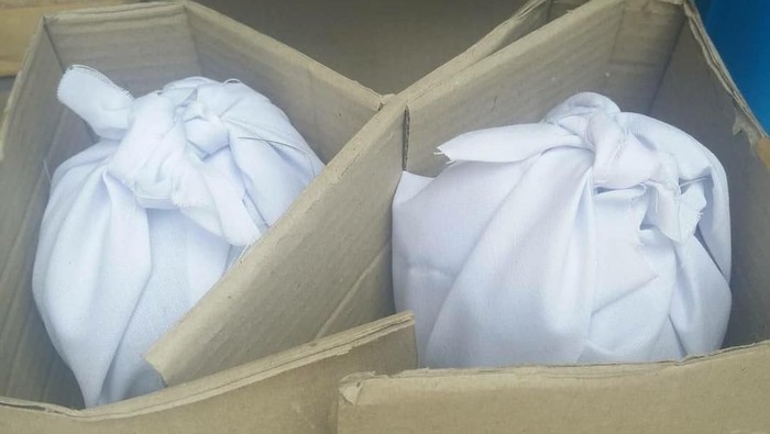 "Isinya buah naga, langsat, jeruk, dan buah pir. Ada juga tanaman seperti mawar, anggrek, sedap malam, yang terbungkus kain mori atau dikenal dengan nama kain kafan," terangnya.