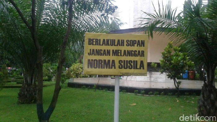 Dari pantauan detikcom, papan berwarna hitam kuning ini dipasang Dinas Lingkungan Hidup (LH) di beberapa titik taman. Papan itu bertuliskan 'Berlakulah Sopan Jangan Melanggar Norma Susila'. (fat/fat)