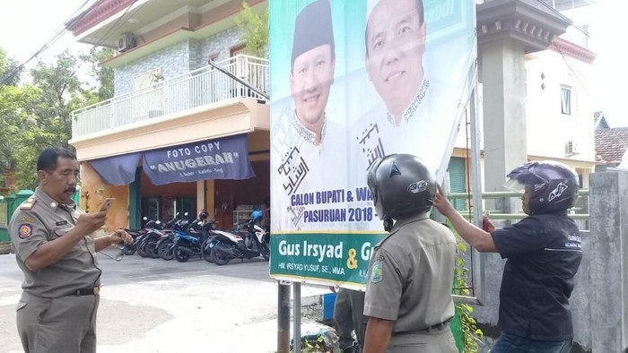 Penertiban dilakukan sehari setelah penetapan paslon tunggal bupati dan wakil bupati Pasuruan, Irsyad Yusuf-Mujib Imron (Adjib) yang diusung 9 partai dengan 100 persen kursi parlemen atau 50 kursi.