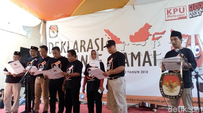 Mojokerto - Deklarasi kampanye damai di Pilwali Mojokerto 2018 diwarnai adu pantun Jawa (Parikan) paslon wali kota dan wakil wali kota. Selain siap menjaga persatuan, dalam deklarasi ini setiap paslon juga berkomitmen anti politik uang, politisasi SARA dan penyebaran HOAX.