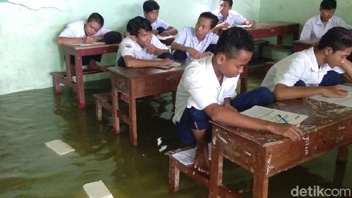 Akibatnya, para pelajar yang sedang menjalani Ujian Tengah Semester (UTS) harus ikut. Mereka terpaksa belajar di tengah-tengah air meluap. Mereka terpaksaa naik perahu untuk berangkat sekolah, lantaran jalan utama masih banjir.