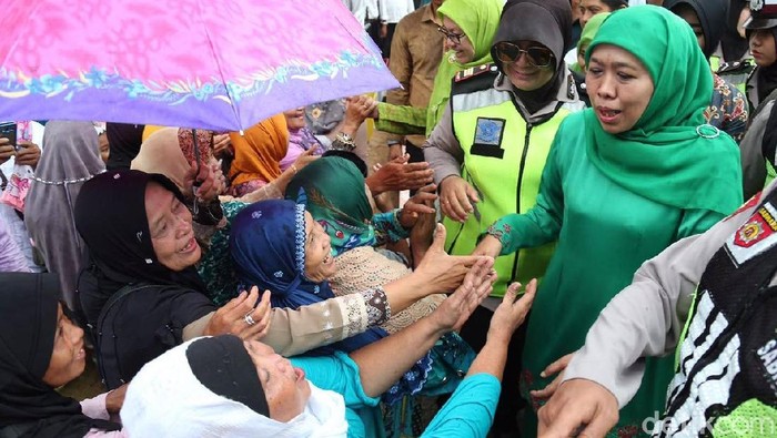 Selepas ziarah, Khofifah disambut pengunjung yang hendak berziarah. Khofifah pun menyapa, menyambut permintaan masyarakat berswafoto untuk mengabadikan momen.