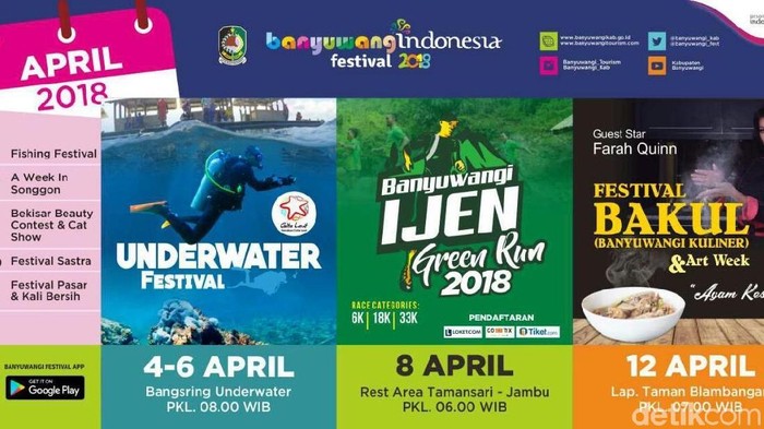 Kepala Dinas Kebudayaan dan Pariwisata Yanuarto Bramuda menambahkan, event lainnya yang digelar di bulan April adalah "A Week in Songgon" (21-29 April), Kontes Bekisar dan Kucing (22 April), Festival Sastra (28-29 April), dan Festival Pasar dan Kali Bersih (29 April).