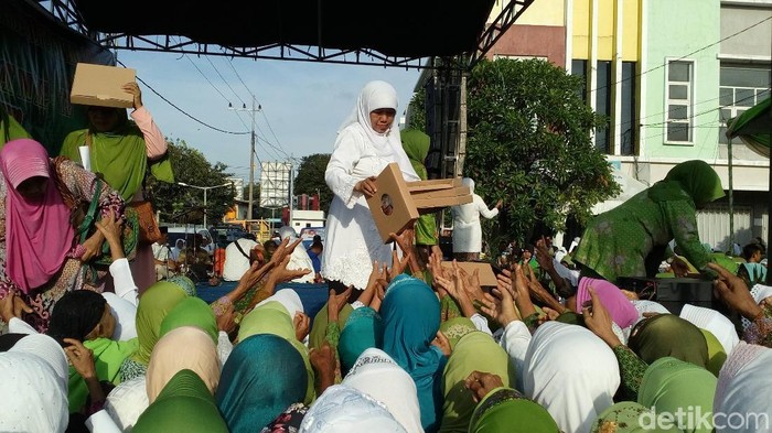 Bagi-bagi hadiah ini dilakukan Khofifah di acara peringatan Isra' Mi'raj Nabi Muhammad SAW dan Harlah Muslimat NU ke 72 di area parkir pertokoan Royal, Mojosari, Mojokerto, Sabtu (7/4/2018) sore. Ribuan anggota Muslimat memadati lokasi.